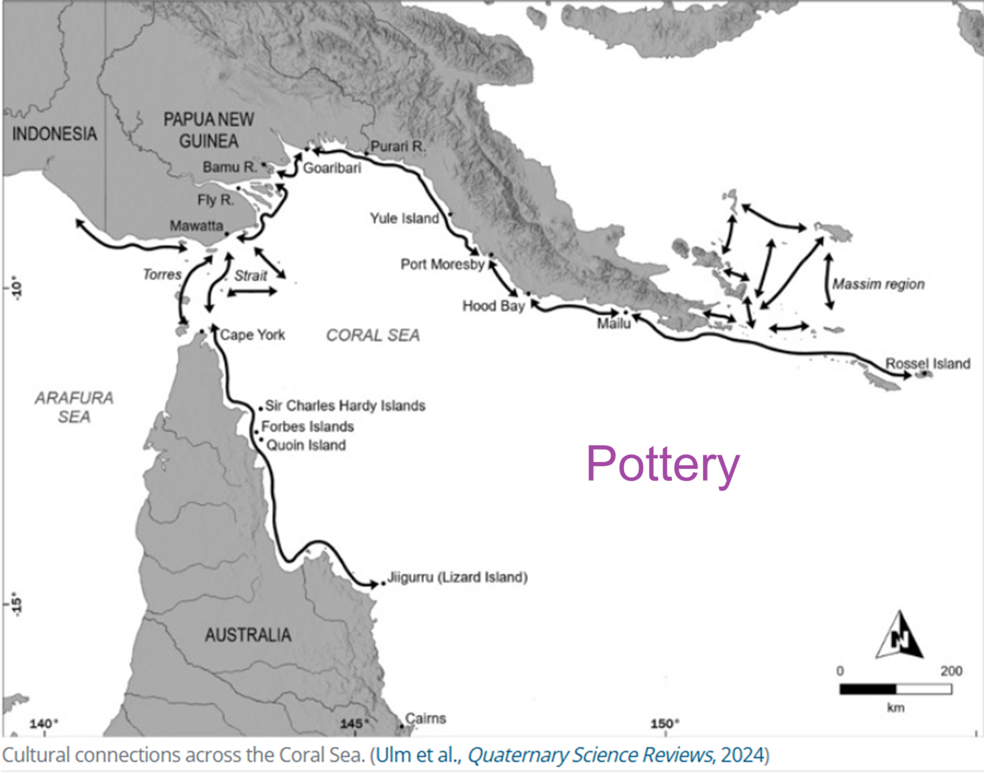 “Recent molecular studies on humans have likewise yielded a diversity of interpretations, ranging from a deep but undated split distinguishing Australians even from their immediate neighbors to the north in New Guinea to a very recent immigration event within the Holocene in the past 10,000 years. However, there was a minor gene flow into Australia, and this could have taken place before the land bridge between Australia and New Guinea was submerged ≈8,000 years ago, thus calling into question that certain significant developments in later Australian prehistory (the emergence of a backed-blade lithic industry, and the linguistic dichotomy) were externally motivated. Archaeological data indicate the intensification of density and complexity of different stone tools in Australia during the Holocene period and the emergence of backed-blade stone-tool technology. The first Dingoes (Canis lupus dingo) also appear at about the same time (3,500–4,000 years ago) and were proposed to have been introduced by new human arrivals, from India, along with new stone tool types.” ref
